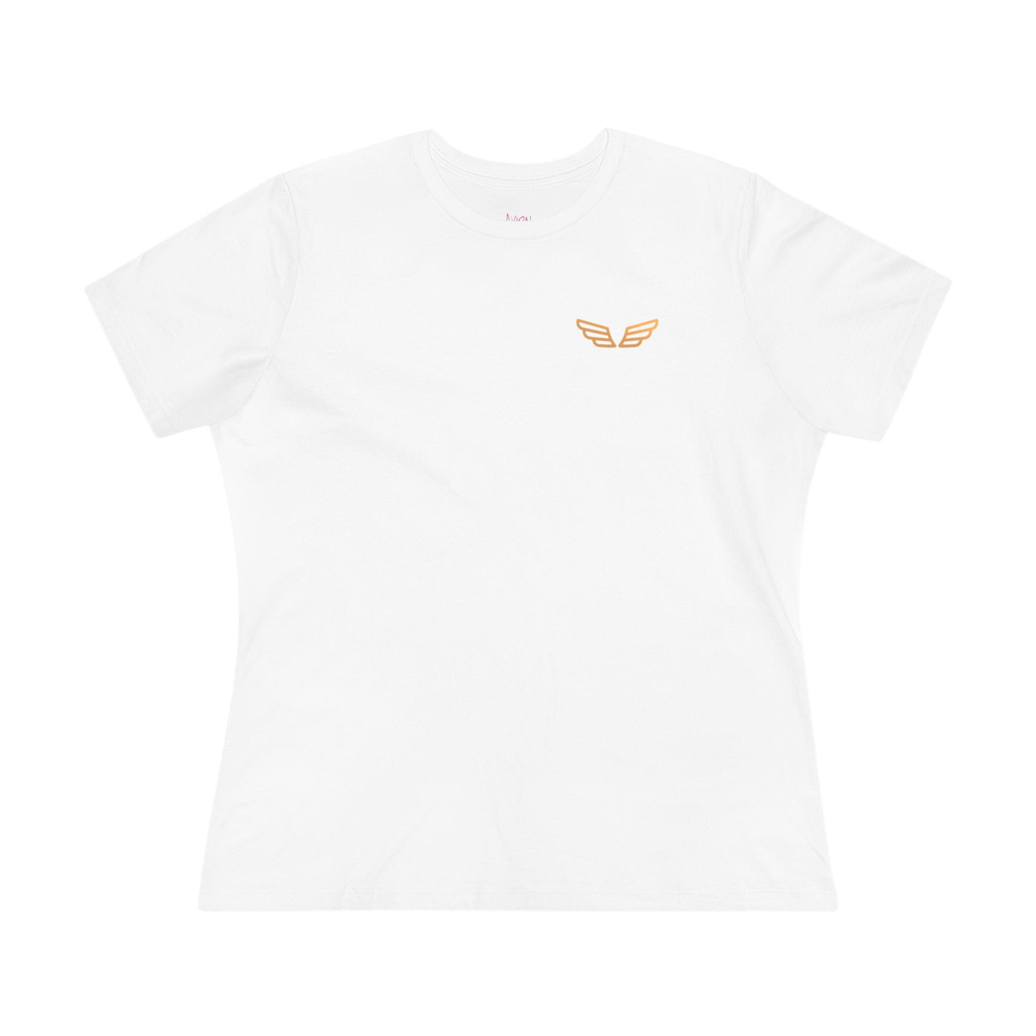 Available in select colors, this is the women's fitted version of our unisex Wings Tee. This fit features shorter and more tailored sleeves, with a slightly narrower waist.
